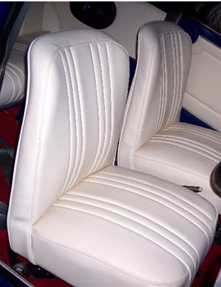A classic little car which has appeal to both young and older generations. This car was re-trimmed in a cream leather look a like vinyl in an original stitch design. The seats, Door-trims and headlining have all been re-trimmed in the same material. |